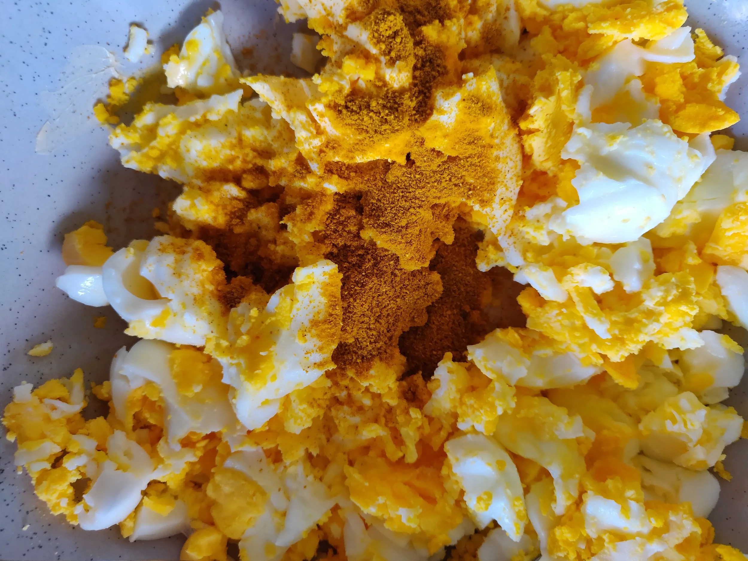 Peel and add the eggs in a bowl. Add 30 grams butter. Mash the eggs and butter until combined. Add the curry powder and incorporate it into the egg and butter.