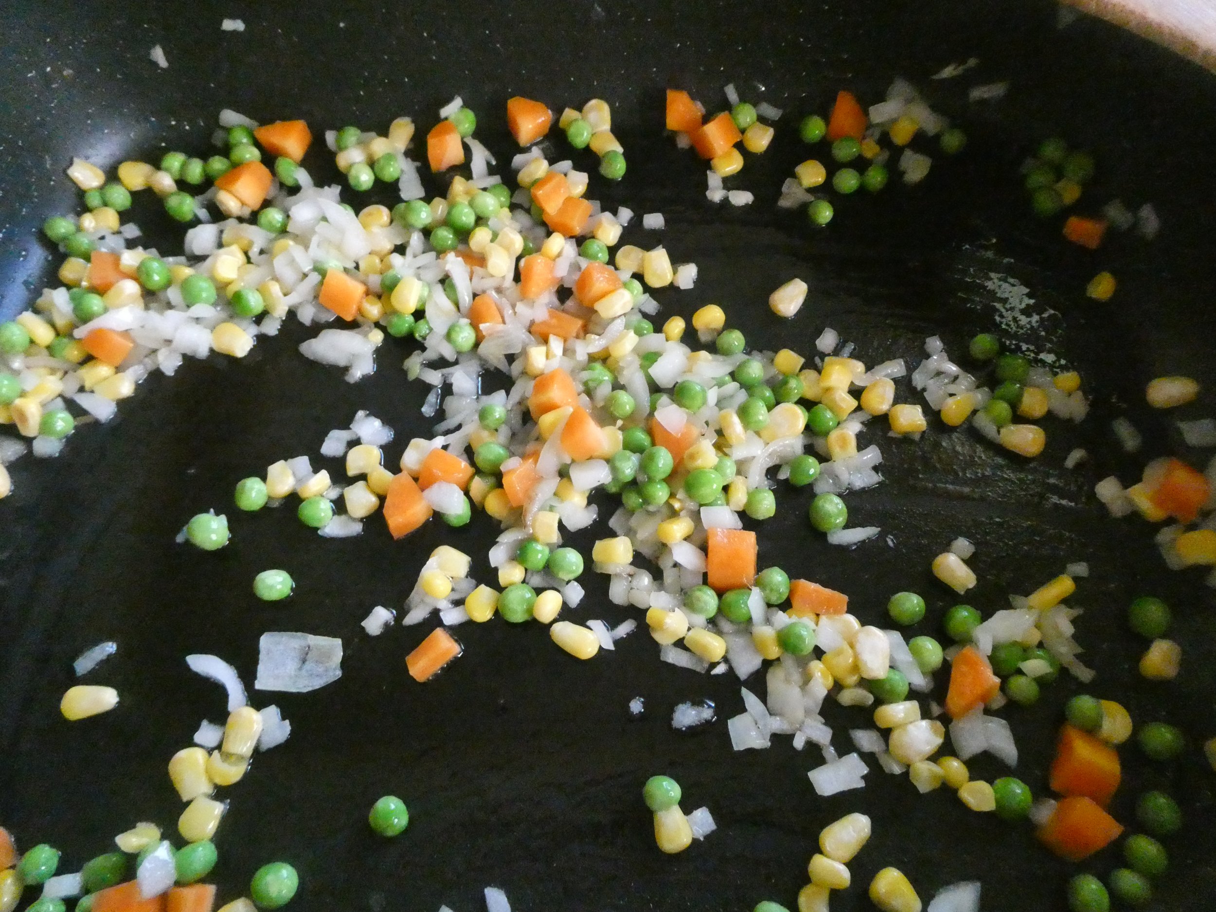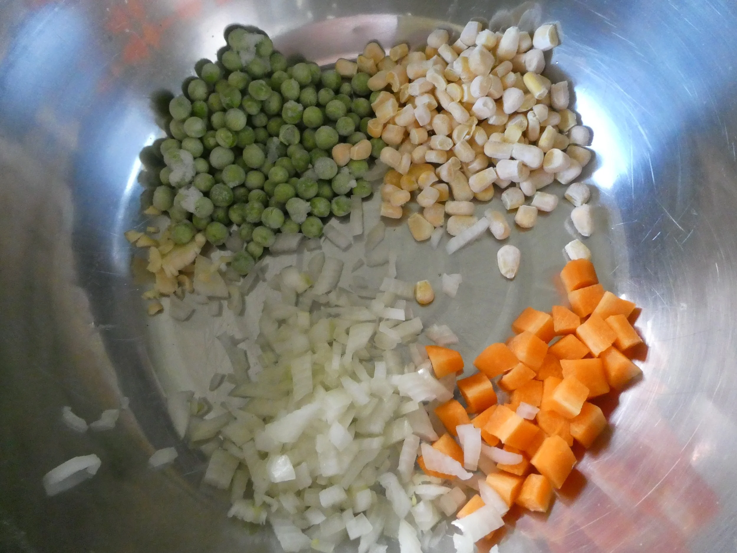Dice the onion, garlic and carrot. Set aside with the corn and peas.
