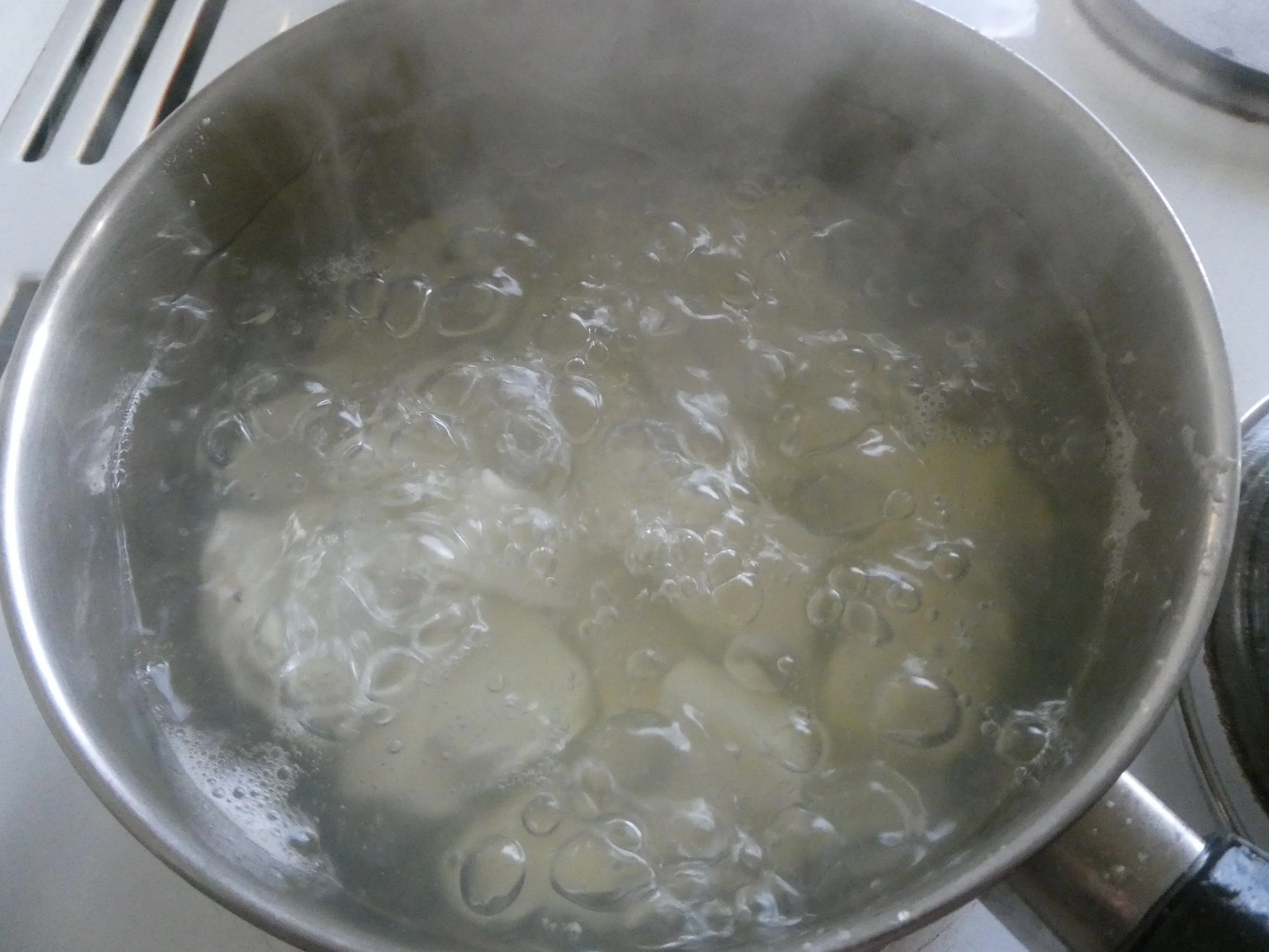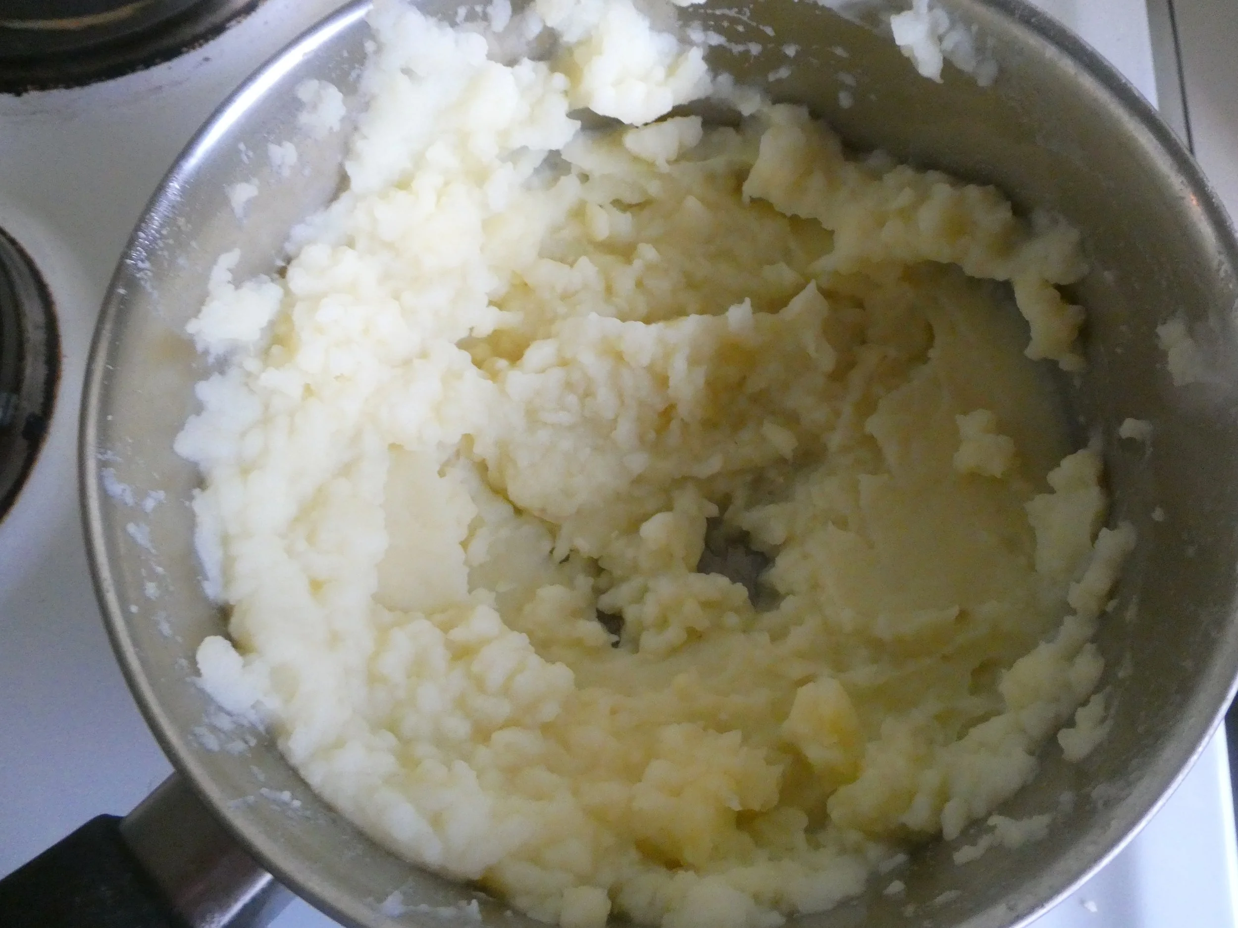 While the filling cools, peel then dice your potatoes. Add the potatoes in a pot with water and boil them for 20 minutes until soft. Once cooked, drain the water. Add the butter and milk, then mash it. You may need to add more milk to make it creamier. You don't want the mash too runny though, so be careful.