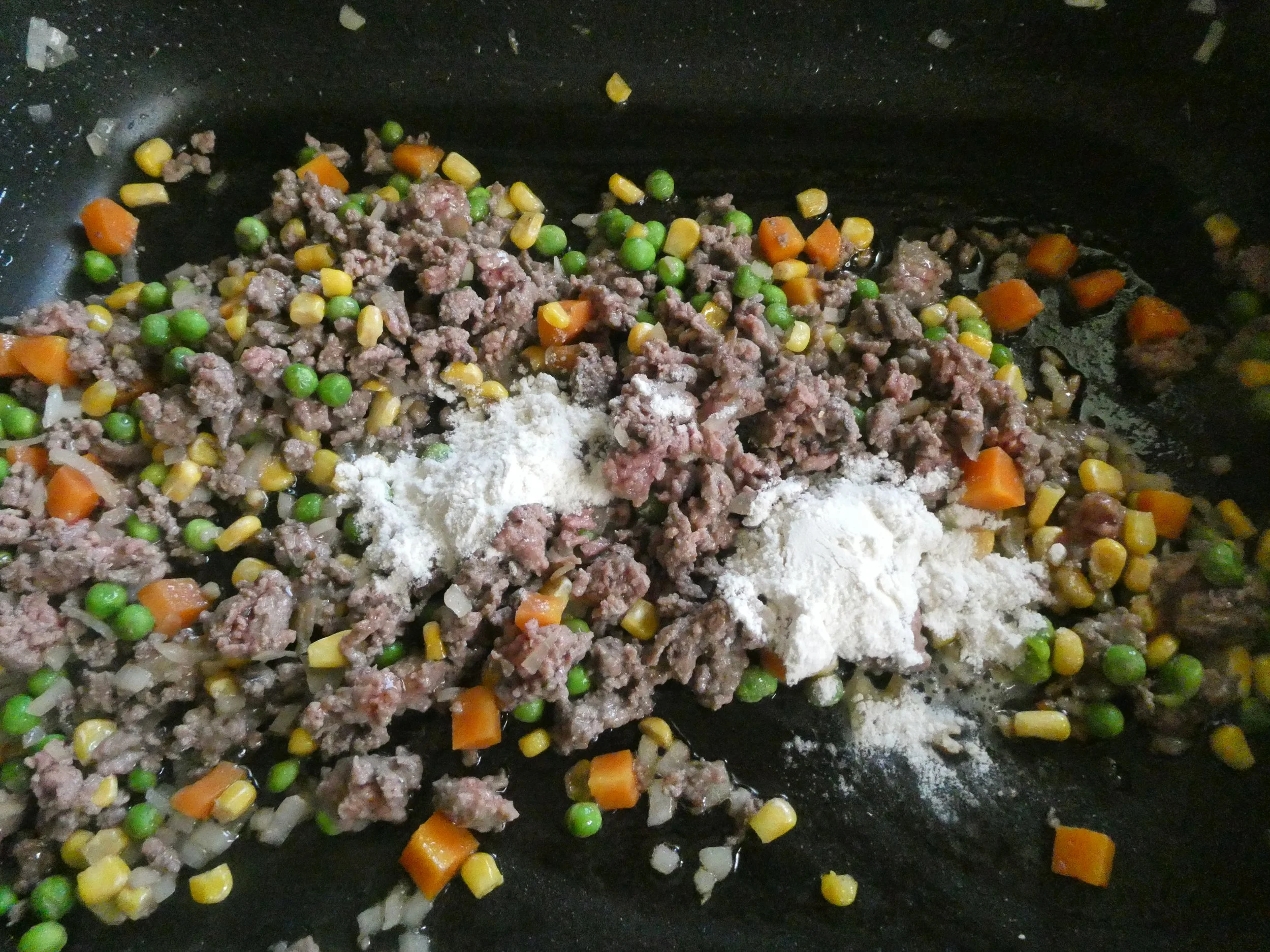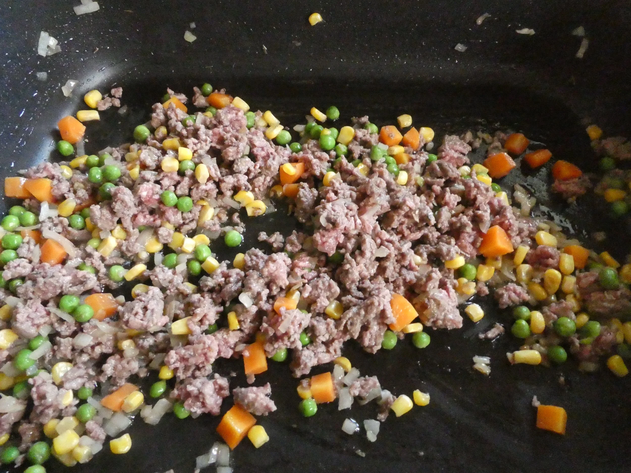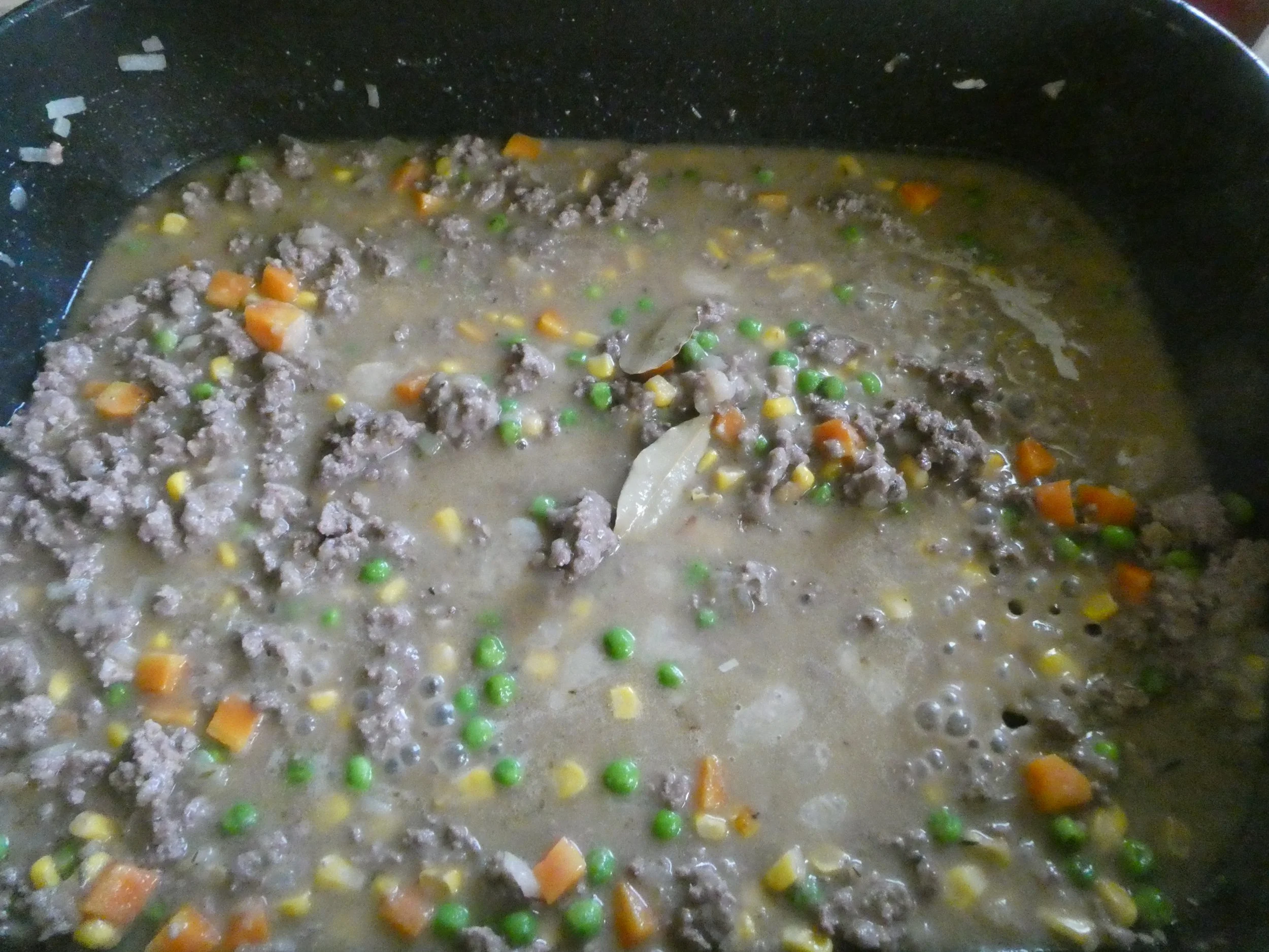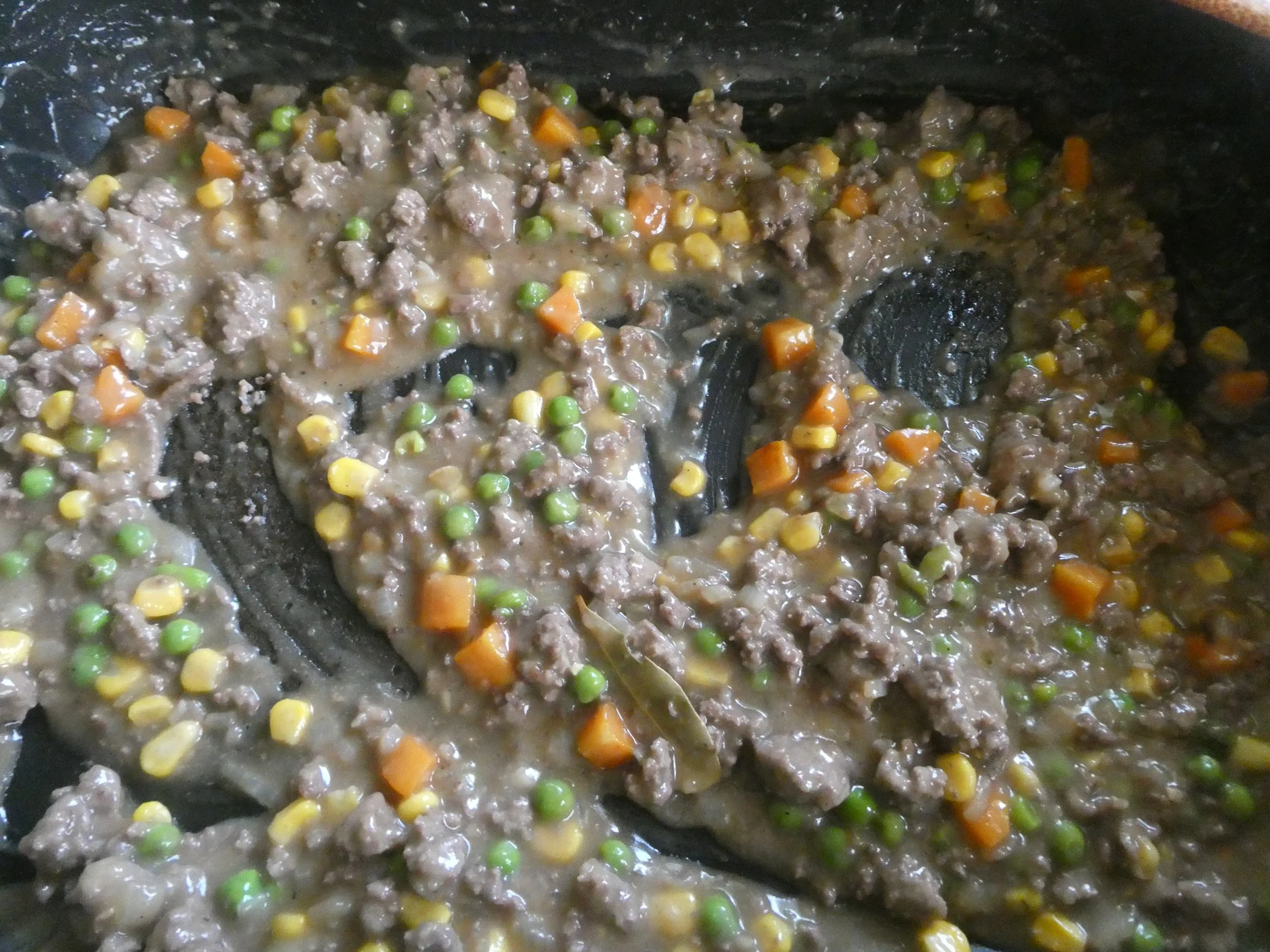 In a pan, heat the oil on medium heat. Add the carrot, onion, peas, corn, garlic, salt, pepper, thyme and bay leaves. Cook until the onion has turned clear. Add the beef mince (ground beef). Cook it until the mince turns brown. You may need to drain the mix if there is too much oil.