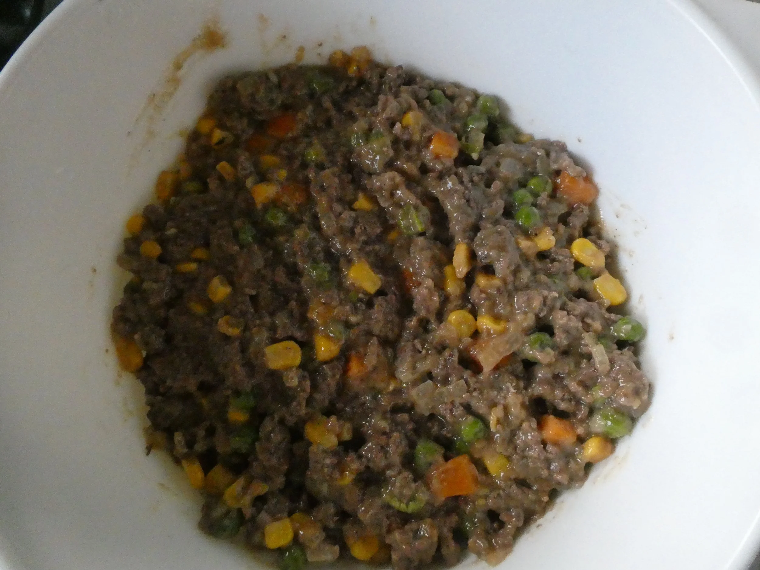 Use a Pyrex dish or any type of baking tray, that's a good size to make the pie. Layer the cold mixture in the bottom of the dish. Spread it out evenly. Layer in the mash potato on top. Use a knife and flick up to create peaks. Try not to go through all the way as some of the mixture will leak out when it's hot. Put it in a preheated oven 180 degrees Celsius for 40 minutes until the potato peaks are brown.