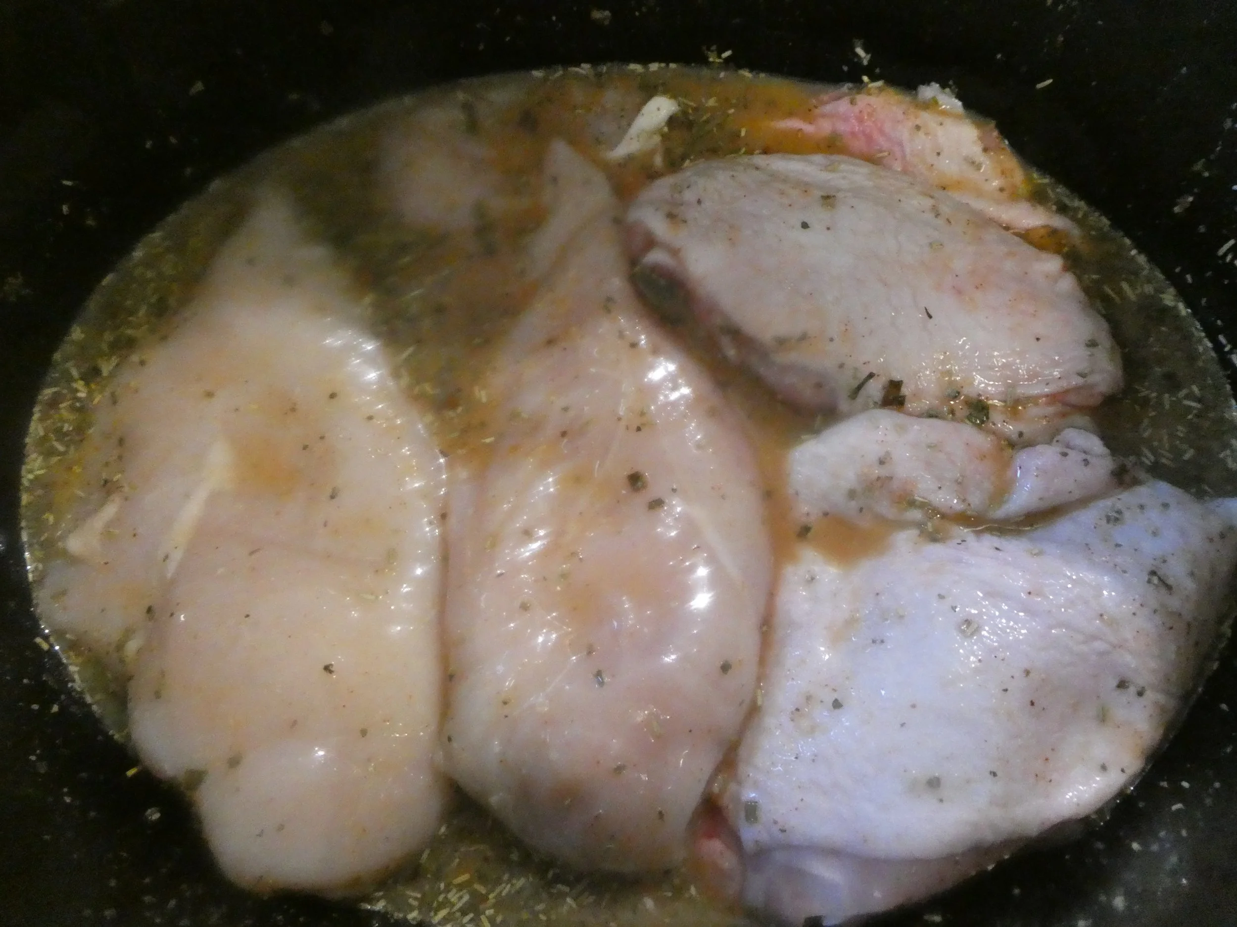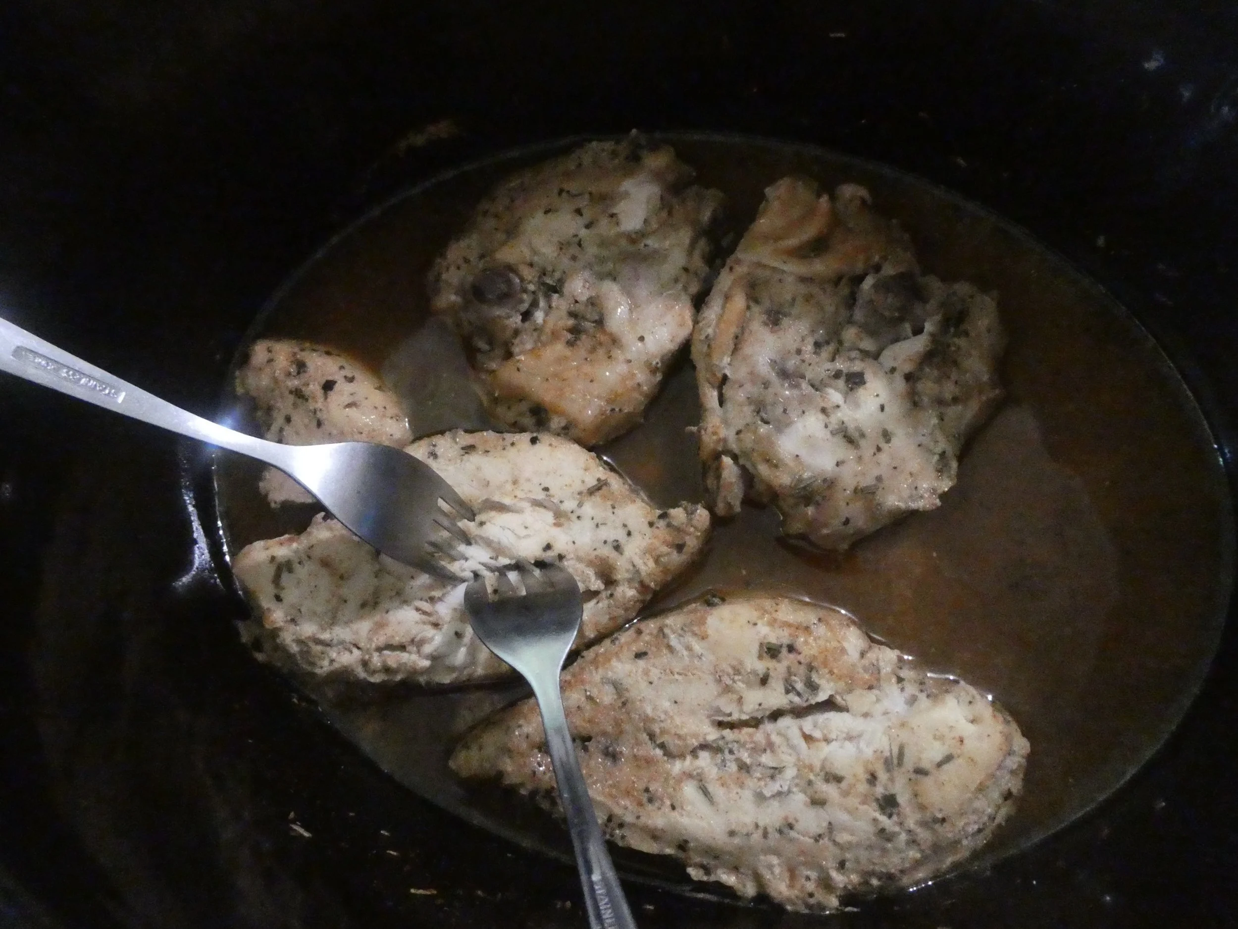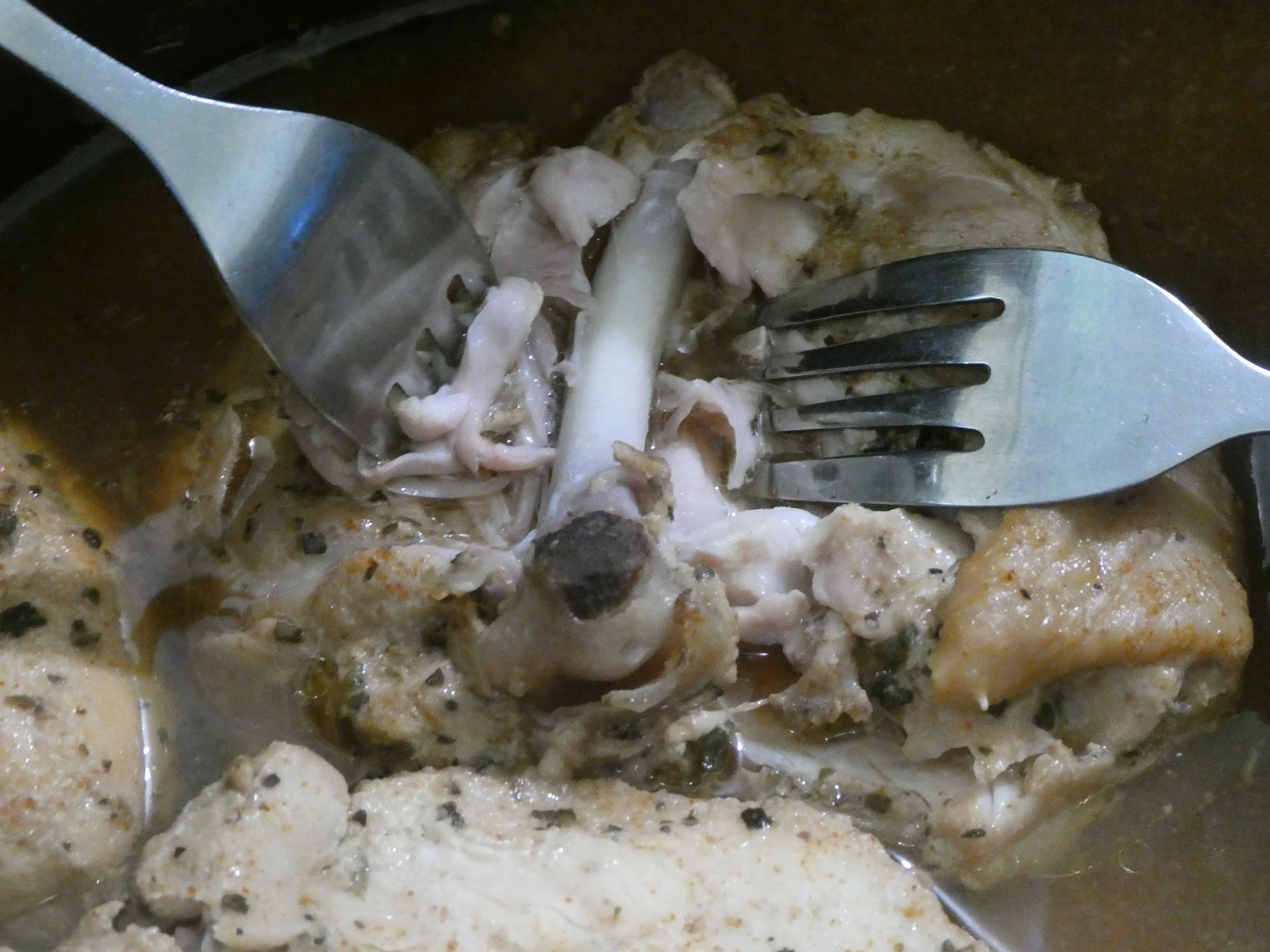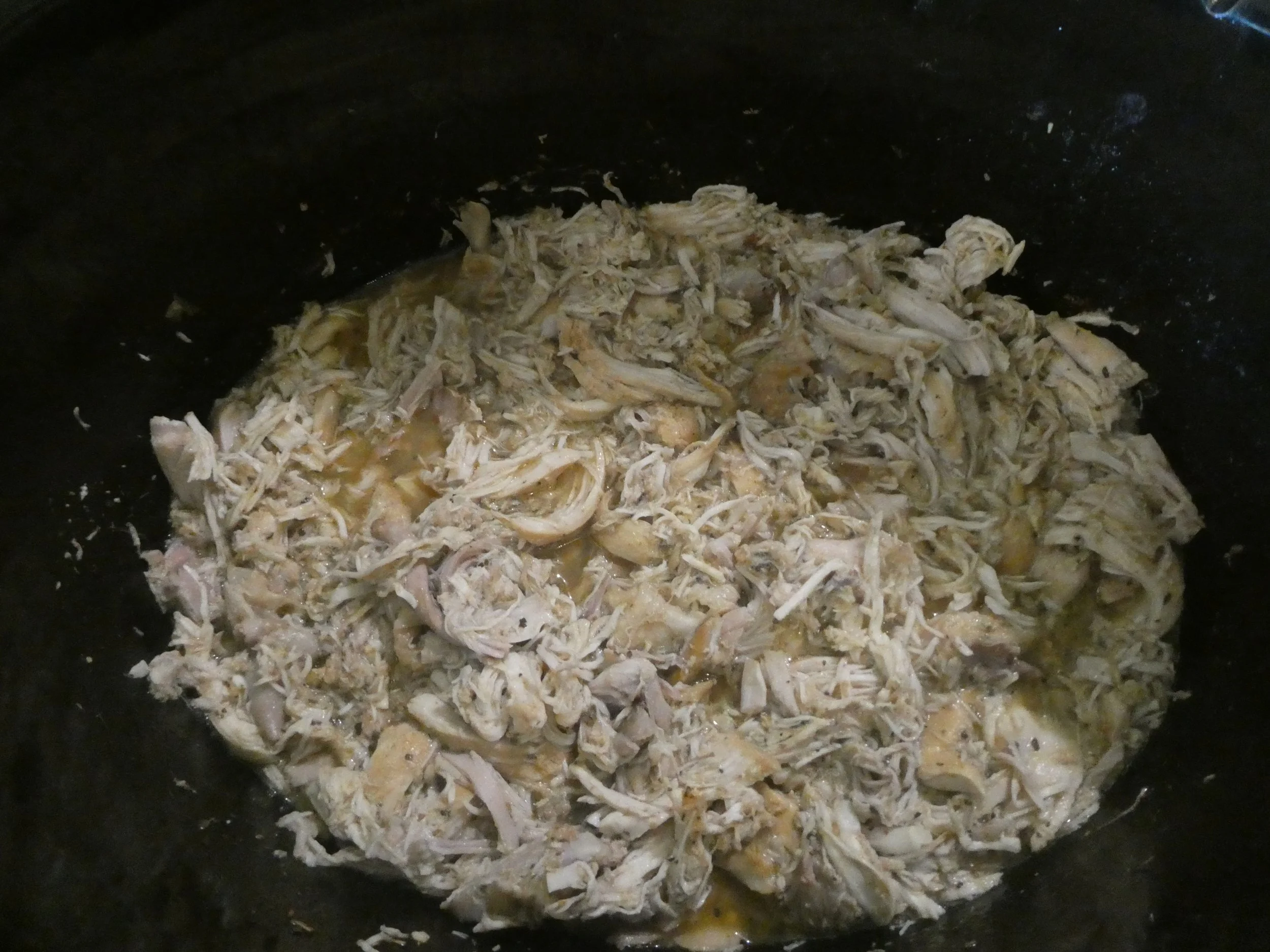 To shred the chicken use two forks, stick them in the chicken pieces close together and move them apart. Take out any bones. The chicken will soak up the juices as you shred it. Enjoy!